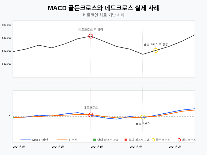 - 0선과의 관계 확인: 0선 위에서 발생하는 골든크로스와 0선 아래에서 발생하는 데드크로스가 더 신뢰성이 높습니다.