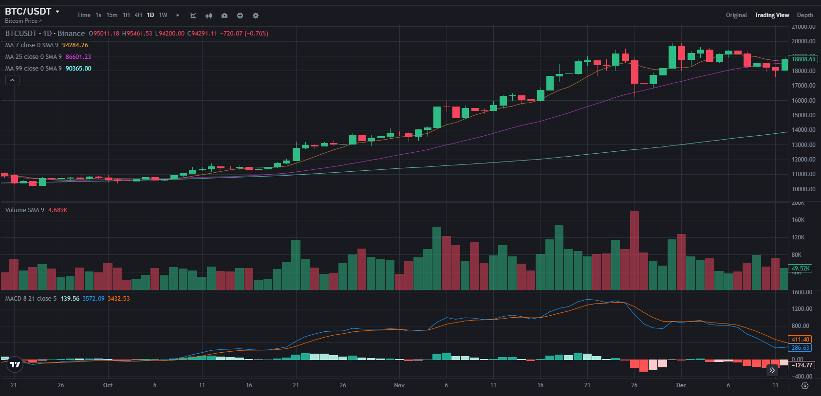 2020년 10월 비트코인 일봉 차트에서 발생한 MACD 신호: